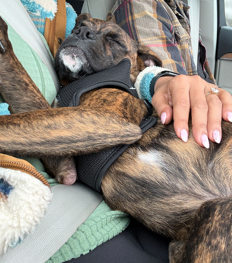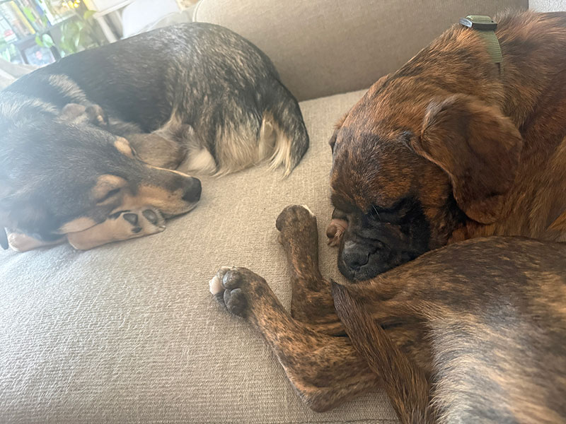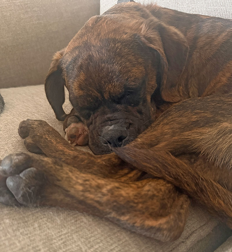 As a young boxer, Batman is still learning the ropes and would thrive with a patient, loving family. He’s already a great sleeper, happily snoozing through the night in his crate. Since we’re home during the day, he currently enjoys two daily walks and plenty of playtime with our resident dogs, so a home with time for daily walks and maybe a canine cuddle buddy would be ideal for him.