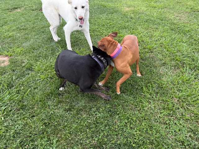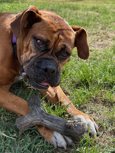 Queen enjoys her furry housemates and gets along well with them, she could potentially be homed with another calm, low energy dog. While Queen hasn’t been around many children, due to her arthritis and mobility limitations it’s best that she go to a home with older children.