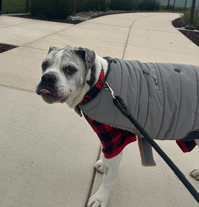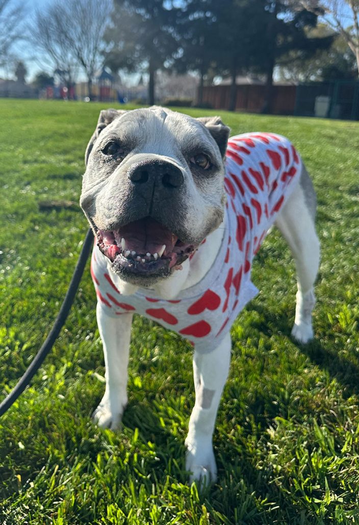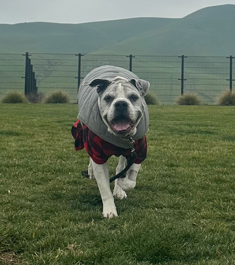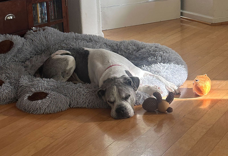 Spartacus is a gentle, affectionate soul wrapped in the most charming grumpy old man face. He’s calm, easygoing, and happiest when he’s touching his people, whether he’s curled against your leg or snoozing at your feet while you relax. Most of the day he’s mellow and content, but he still has adorable bursts of puppy energy. A few times a day he’ll break into zoomies, grab his favorite plush toy or squeaky ball, and toss it into the air so he can catch it himself.